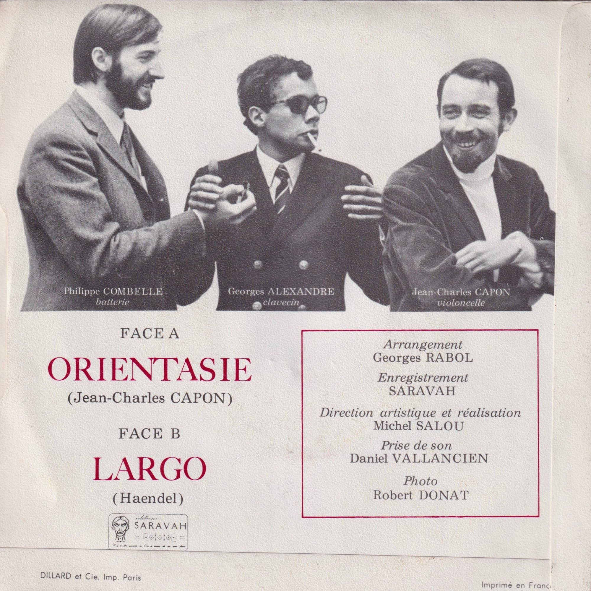 Alongside Alfred Panou & the Art Ensemble of Chicago’s “Je suis un sauvage”, the Baroque Jazz Trio’s EP “Orientasie / Largo” is probably one of the rarest and most sought-after releases on the Saravah label. Baroque Jazz Trio was formed by 3 experienced musicians : George Rabol on harpsichords, Jean-Charles Capon on cello & Philippe Combelle on drums & percussions,