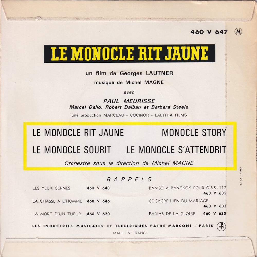 Original soundtrack from the cult French satirical spy film Le Monocle rit jaune by director Georges Lautner, starring the ever-cool Paul Meurisse.